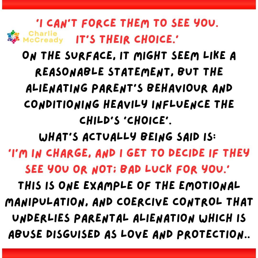 Taking, ‘it’s their choice’ at face value fails to recognise the extent of coercive control, psychological abuse, and manipulation at play, which can have profound negative effects on the child’s emotional development and well-being.