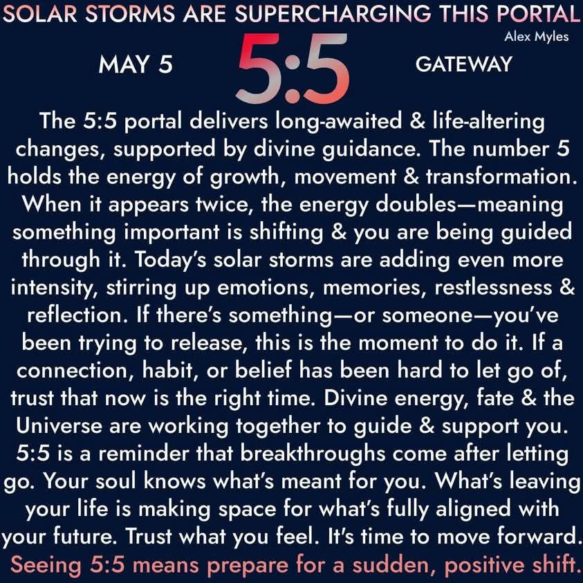 The 5:5 energy portal creates a powerful shift in both the physical and energetic worlds. This portal acts as a bridge between your past and the future you are now stepping into.