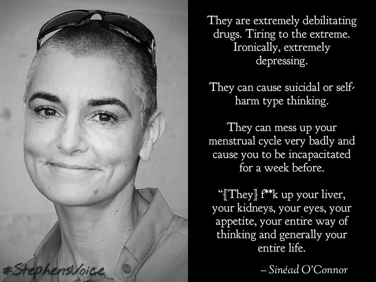 Sinead O’Connor was left suicidal, suffering mental health breakdowns, and wanting to self harm because of the medication she was prescribed.