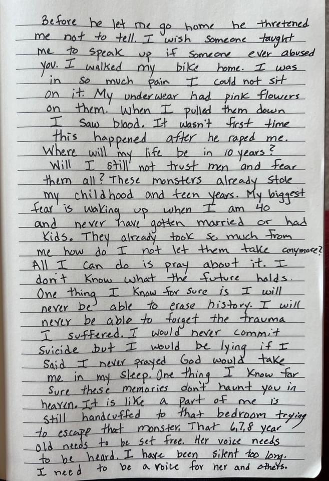 What you read below in this journal is what Hell on Earth looks like and it’s happening all the time to children. On this same day he pulled out a pocket knife as he sat next to me on his bed. He took my finger and made me feel how sharp it was. He told me this knife would hurt me a lot more than him. At 8 years old I feared I was not going to make it out alive. I will never be able to understand how someone could inflict this type of pain on a child looking down at them crying and have no care in the world. I have often wondered what could cause someone to become this evil. How did this man become such a monster?