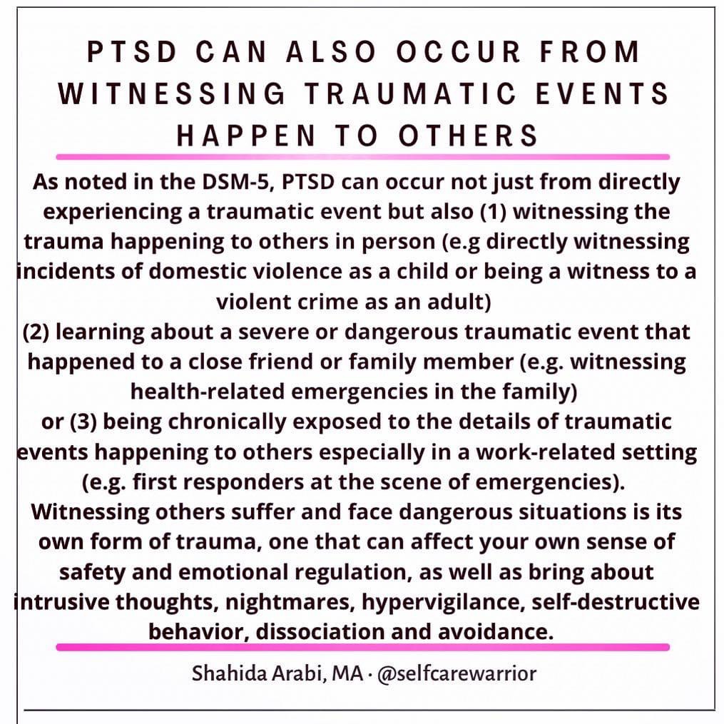 PTSD can occur not just from directly experiencing a severe traumatic event but also witnessing it happen to others, including close friends, family and loved ones as well as being chronically exposed to the details of the trauma of others in work-related settings.