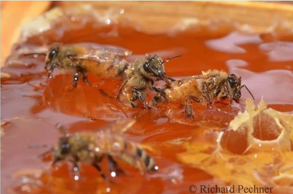 My dad has bees.Today I went to his house and he showed me all of the honey he had gotten from the hives. He took the lid off of a 5 gallon bucket full of honey and on top of the honey there were 3 little bees, struggling. They were covered in sticky honey and drowning. I asked him if we could help them and he said he was sure they wouldn’t survive. Casualties of honey collection I suppose.