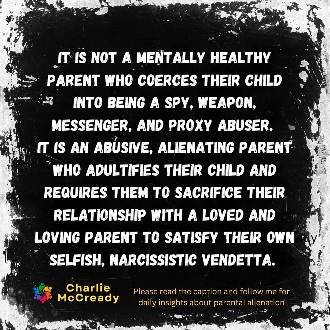 We desperately need legal and mental health professionals and family court judges to understand that ‘parental alienation’ is not mentally healthy parenting. Often it is driven by one parent’s selfish and narcissistic desire for revenge or control over the other parent. The alienating parent forces the child to sever their relationship with the targeted parent, disregarding the child’s well-being and emotional needs in pursuit of their vendetta. Such actions can be emotionally damaging and harmful to the child, as they are used as pawns in the alienating parent’s manipulative tactics.