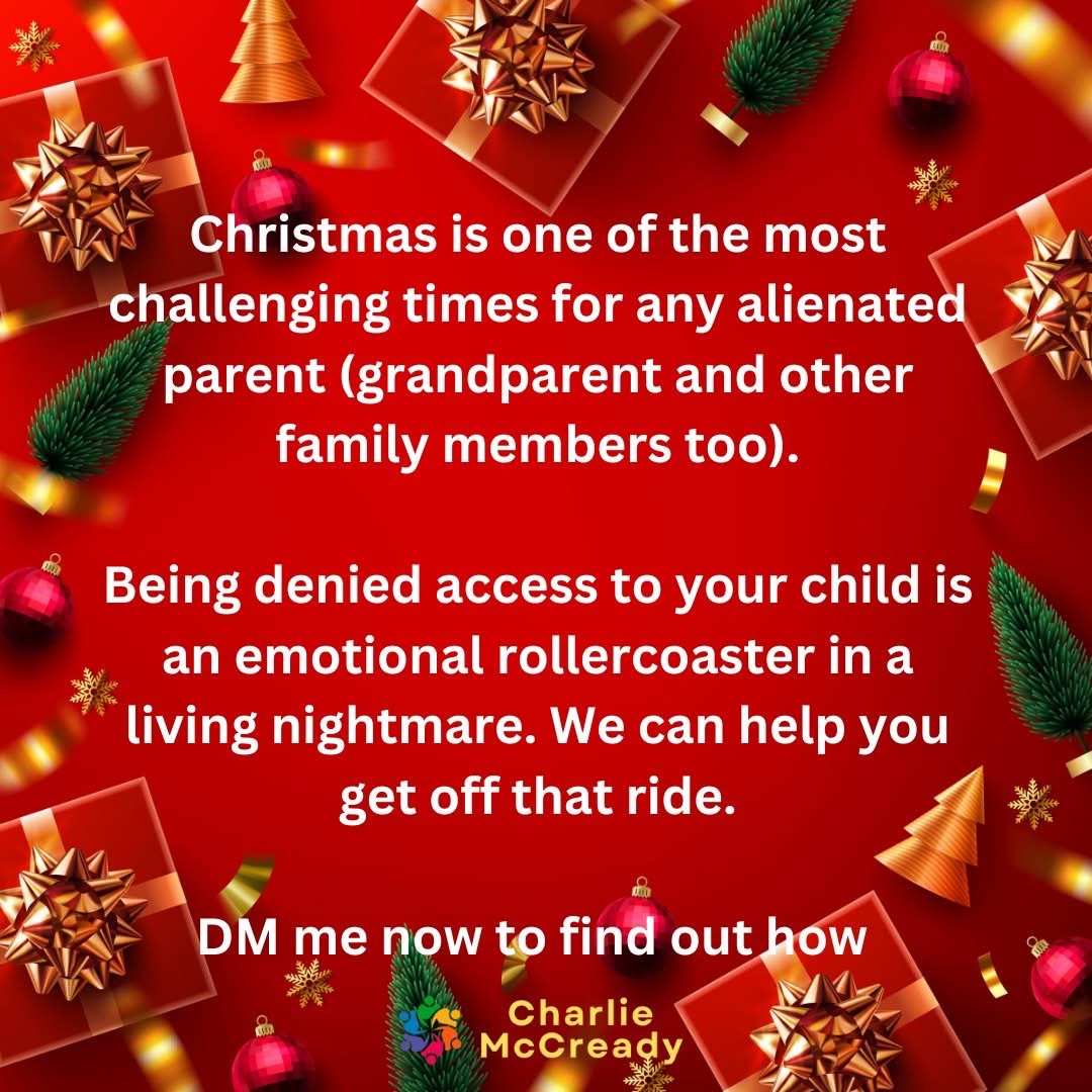 ‘Twas the night before Christmas, when all through the house not a creature was stirring, not even a mouse …’ But for us, alienated parents, that silence isn’t peaceful—it’s unnatural. It’s not supposed to be this way. Our children have been unjustifiably, most cruelly, denied a relationship with us, and the quiet reminds us of their absence. The pain is real and heightened on nights like this. I know from personal experience that Christmas can be an extremely tough time for an alienated parent. The sense of loss is heightened, and you can easily get caught in an emotional loop. You have to deal with not seeing the children and maybe even having your presents rejected or returned. Whilst I cannot make your children come back during the festive season or cure the absence of their presence and laughter, I’m here to help you manage these feelings and find your inner strength. I help many parents, like you, cope far better with the challenges that we face. You can learn to re-frame the way that you experience alienation, changing the way you think, feel and act. I will be working on this with my current clients and anyone else who wants to join my program or coaching. You can shift your perspective and regain a sense of peace, not just for the holidays but moving forward. Reach out for support. If not me, then those close to you who can support you when you need it. Take care, Charlie.