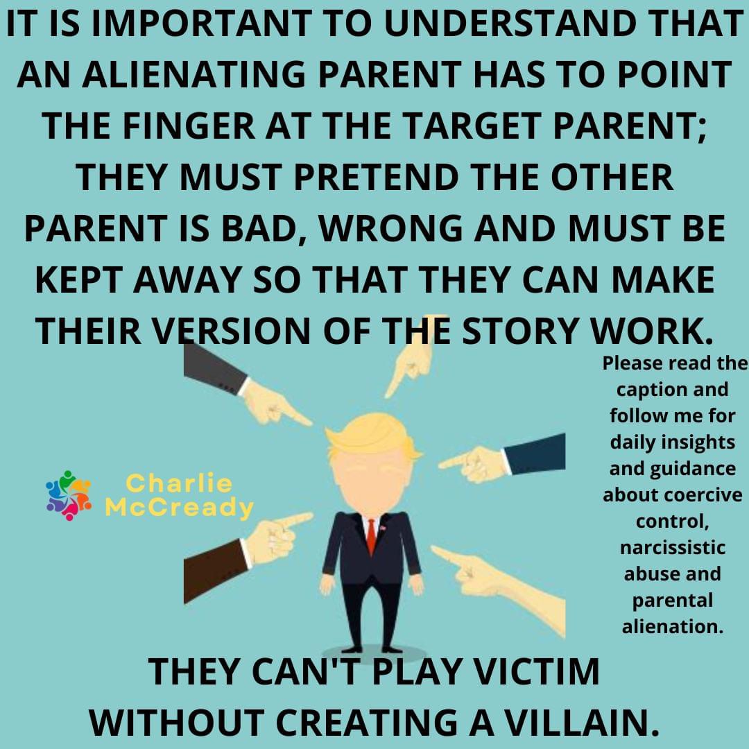 It goes without saying they don’t HAVE to villainise their ex. That’s not the best example to set for the children, nor in the children’s best interests. But it’s often the way someone acts who has a personality disorder as alienating parents typically do.