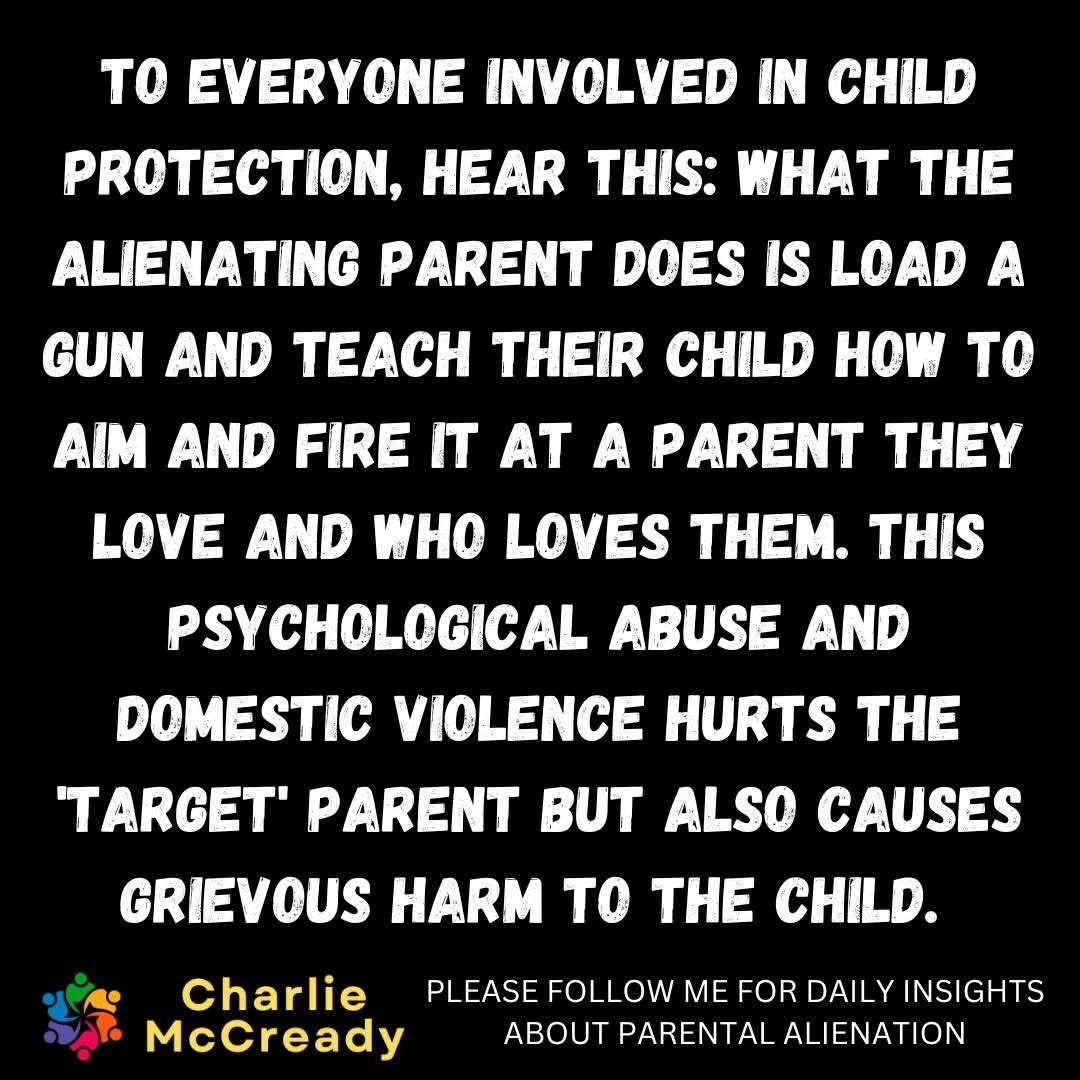 By acknowledging and addressing the gravity of weaponised alienation, we can work toward protecting the targeted parent’s and child’s mental and emotional health. We need to look at who is loading the gun and teaching their child to fire it, as well as educate them so they know the harm they are causing. We can then hope to rebuild healthy relationships and create an environment where the child can flourish without being caught in the crossfire of adult conflicts.
