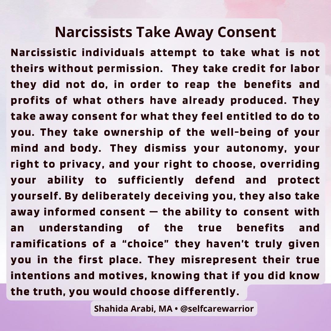 Narcissists take away your consent. This can happen in many different contexts and ways. Whether it’s duping you into a relationship where their intentions are misrepresented or your resources exploited, sexually abusing you, profiting off your labor in the workplace, taking away your rights as a medical patient, or imposing upon you traumas that violate your well-being, they feel entitled to take what they want without permission. They erode your agency and ability to consent in an informed way.