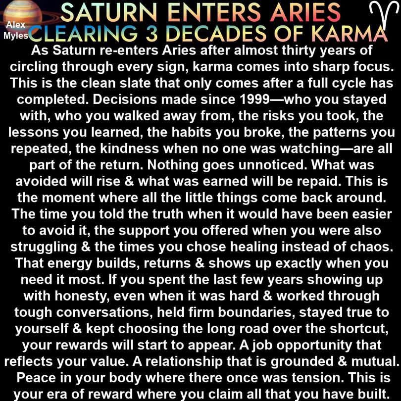 This is the start of a brand-new cycle, carrying the full weight of everything you’ve moved through since 1999. Saturn was last in Aries from 1996 to 1999, and now, after nearly three decades and a full journey through every sign of the zodiac, it has returned.